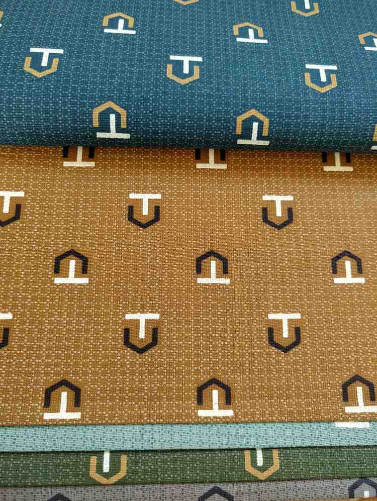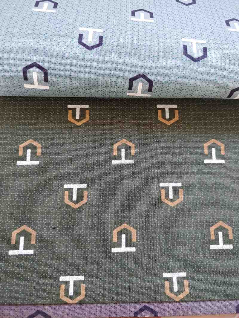 • Pattern: Repeating abstract geometric emblem motif, resembling a stylized “T” within an angular shield or house-like frame