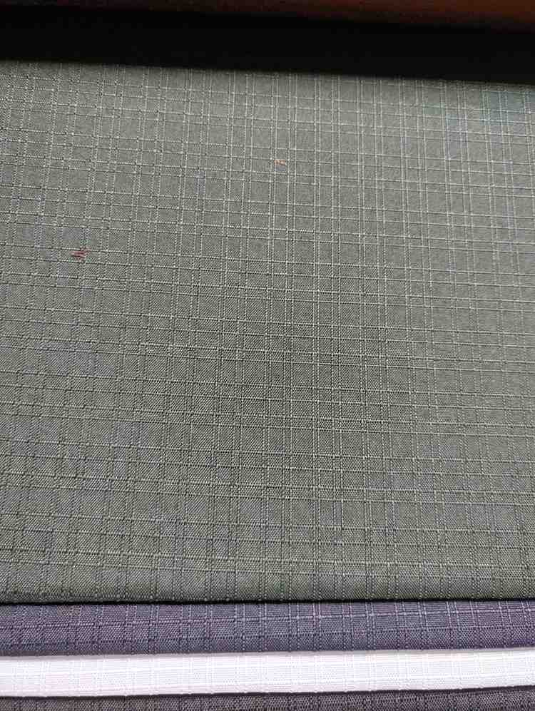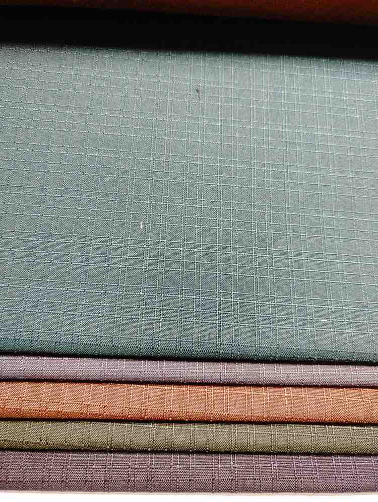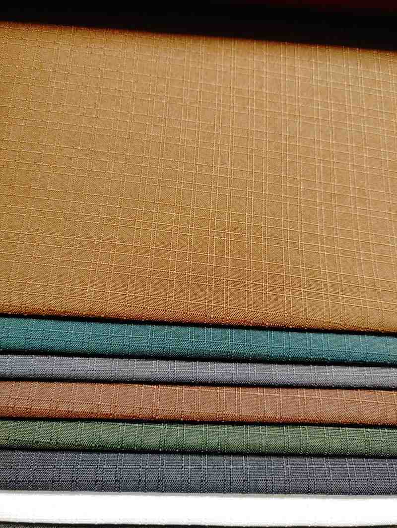• The Fabric shows a stack of fabric swatches, each with a distinct color and texture. The top swatch is a light brown color with a subtle grid pattern, while the others are arranged in a neat stack below it.