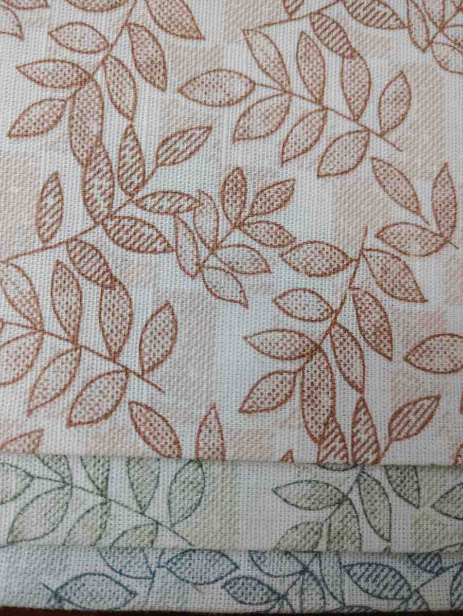- Top fabric: Warm terracotta brown print on a soft peach or beige base.