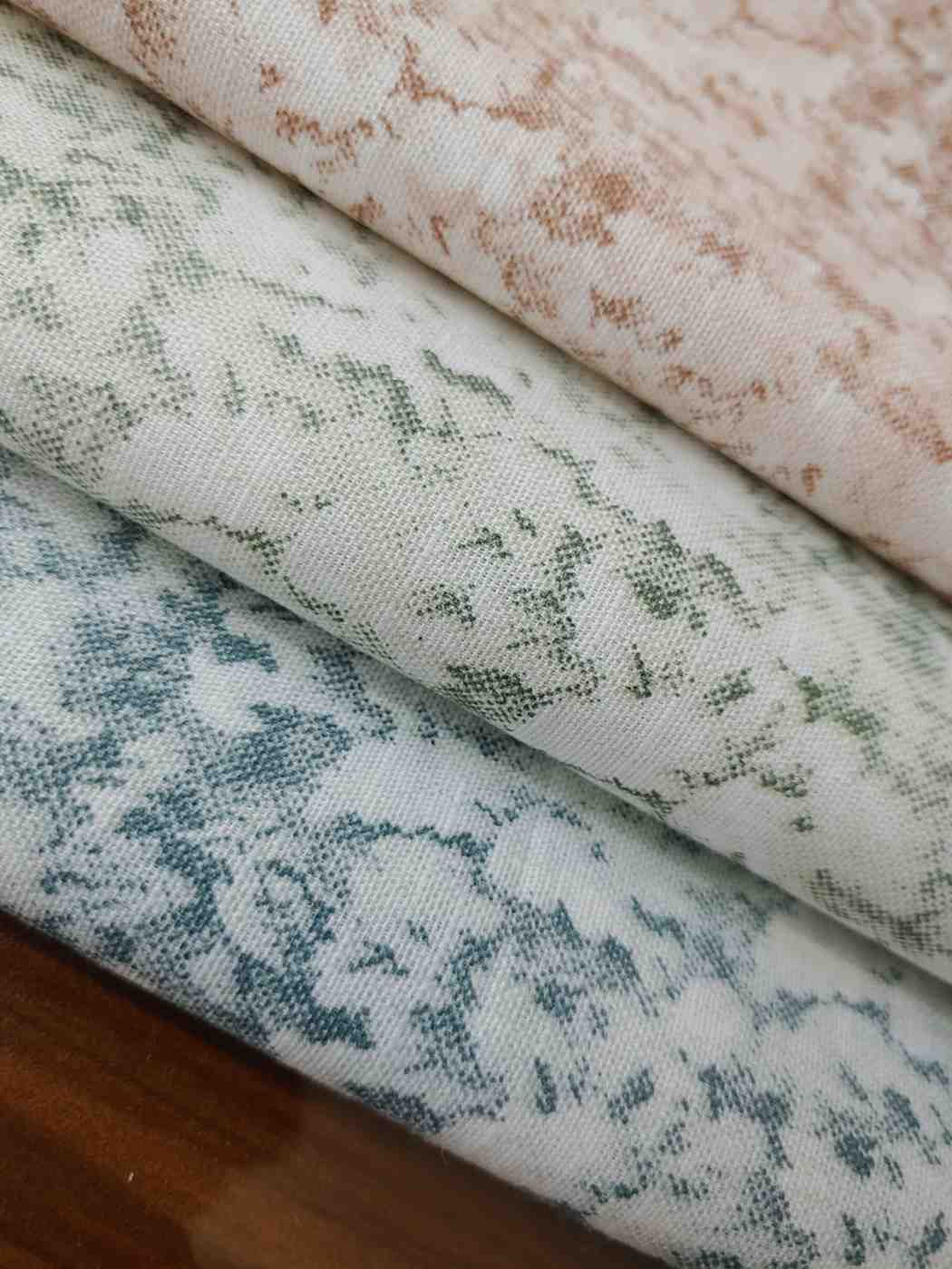 - Middle fabric: Olive green print on a light beige or ivory base.