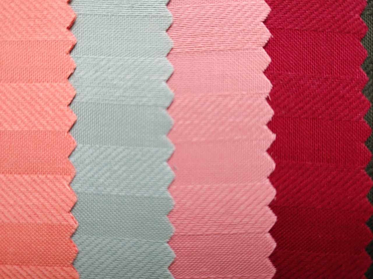 Collection of fabric swatches in various colors, including pink, red, gray, and orange etc. The fabrics appear to be made of a textured material, possibly cotton,and have a zigzag edge. The colors are arranged in a gradient-like pattern, with similar shades grouped together. The overall effect is one of vibrant color and texture, suggesting that the fabrics could be used for a variety of applications such as clothing, upholstery, or home decor.