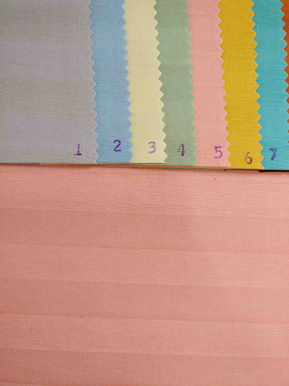 Vertical Strips Pure Cotton close-up of a fabric with pastel colors. The fabric appears to be pleated and has a textured surface. The colors include pink, white, green, blue, light pink, and beige. The fabric is likely used for clothing or Mens Shirt, home decor items such as curtains or tablecloths.The fabric’s description can be summarized as follows:- Material: Pleated fabric- Pattern: Lines- Colors: Pastel shades including pink, white, green, blue, light pink, and beige