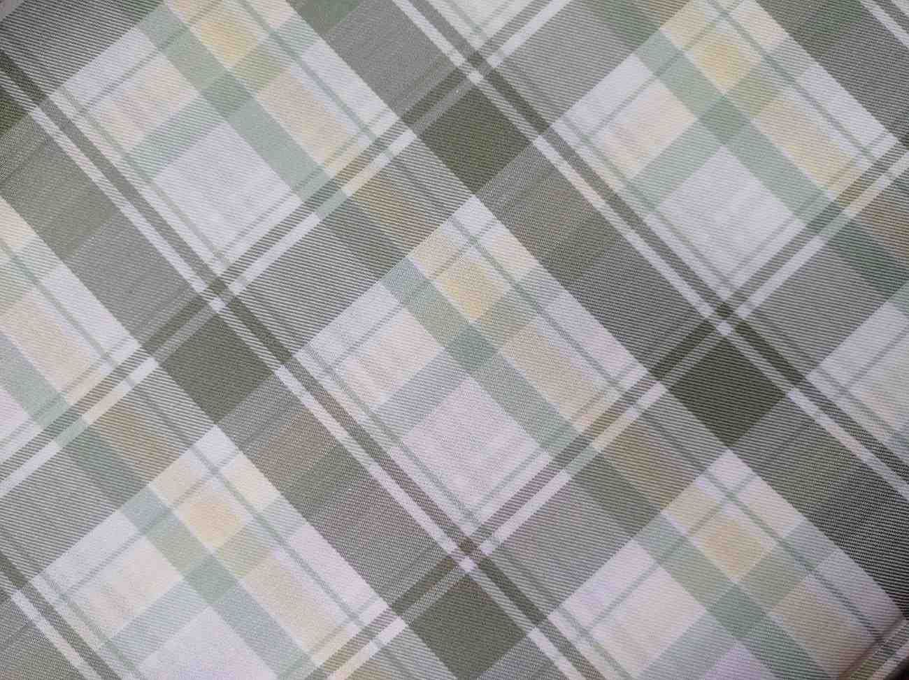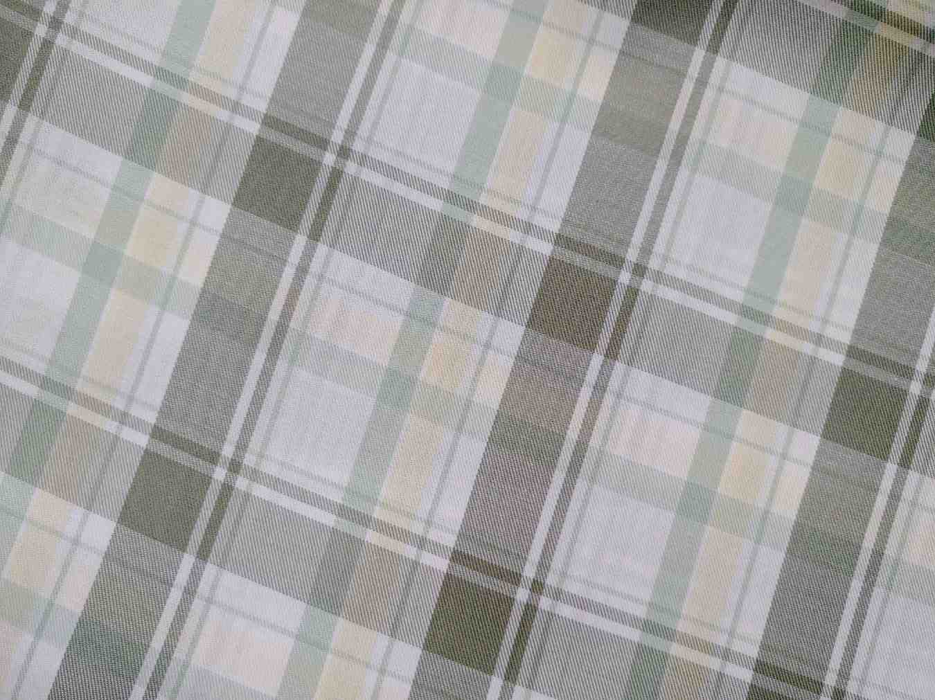 This fabric features a soft, refreshing tartan plaid pattern combining olive green, sage, cream, and white. The subtle, balanced layout evokes a clean, earthy feel ideal for spring and summer garments. The gentle tones and fine weave suggest a breathable and lightweight textile, likely a cotton or blended fabric, perfect for casual wear or school uniforms. Its natural color palette makes it a versatile choice for both fashion and interior accents.
